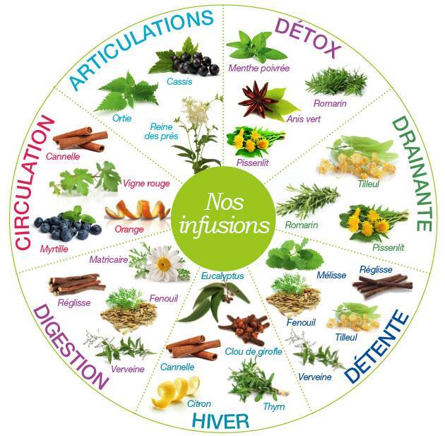 Dans l’optique de contribuer à l’équilibre corps-âme-esprit, il peut arriver que notre petit body ait besoin d’un petit coup de pouce… Je suis tombée sur ce petit rappel des infusions à base de plantes qui aident notre corps physique dans ses différents besoins… Profitez d’une bonne petite boisson chaude naturelle en cette saison plus froide 😉